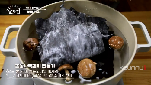 물 2ℓ에 건표고버섯 10개, 다시마 50g을 넣고 15분 끓여 식혀줍니다.