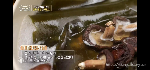 물 2리터에 다시마 50g과 표고버섯 10개를 넣고 15분간 끓여준 뒤 거른 후 식혀줍니다.