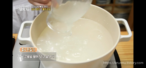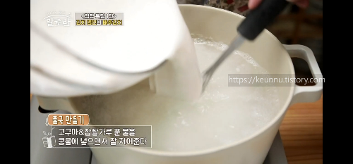 물 4컵에 콩물 2컵을 넣어 끓여줍니다. 물 1컵에 고구마 가루 2큰술과 찹쌀가루 5큰술을 넣어 풀어줍니다.