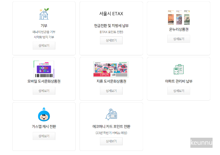 사용은 기부, 모바일 문화상품권, 온누리 상품권, 현금전환 및 지방세 납부가 가능하며 아파트 관리비 차감도 가능합니다.