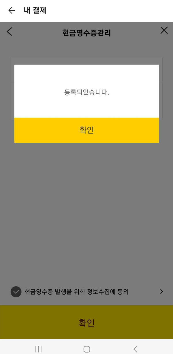 등록하기를 클릭하면 휴대폰 번호 입력과 현금영수증 발행을 위한 정보수집에 동의에 체크 후 확인을 눌러주면 됩니다.